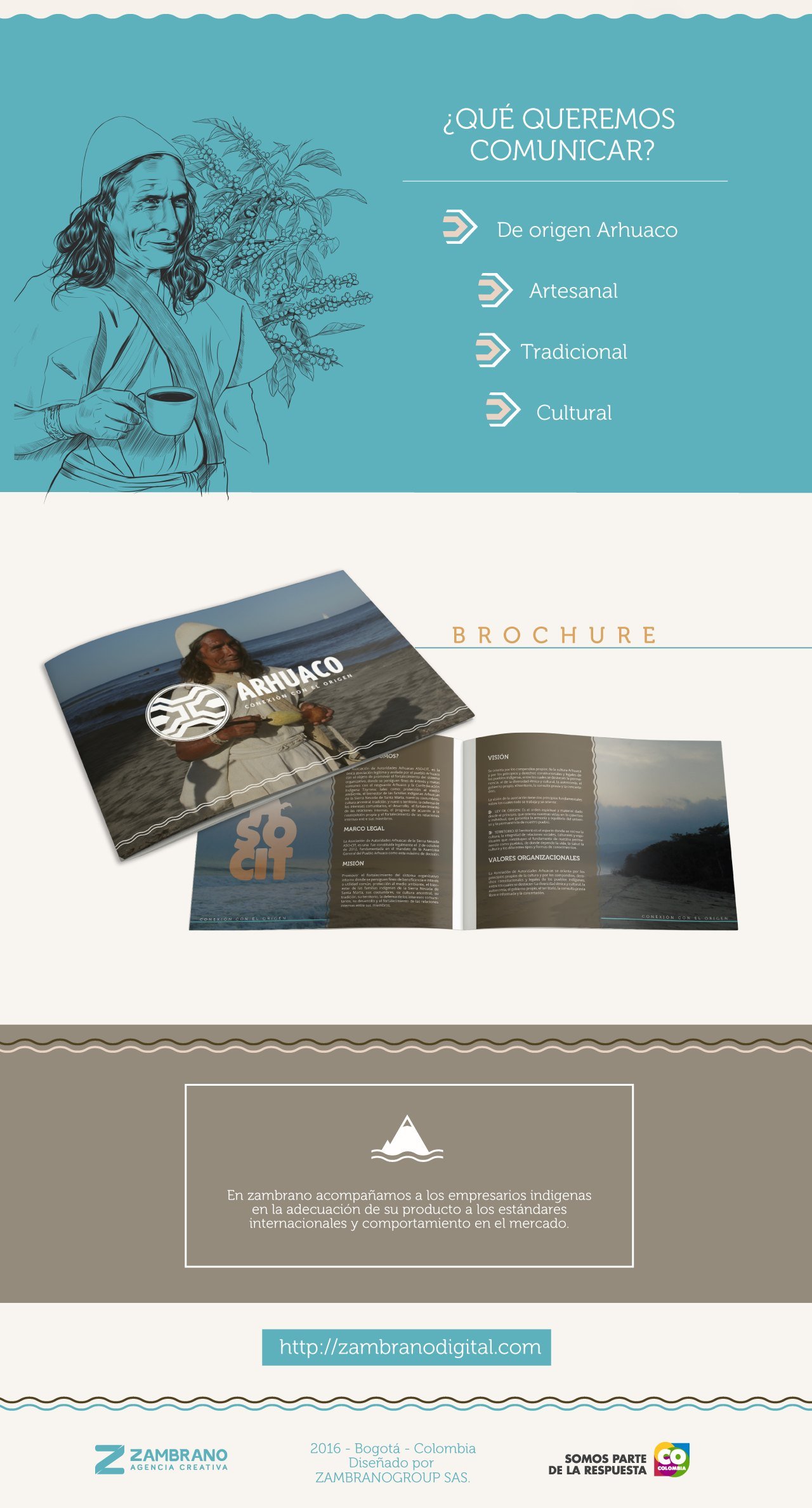 Con un mensaje profundo de protección a la madre tierra y las tradiciones que esta comunidad indígena ha conservado por siglos, los arhuacos ingresan al sector del comercio electrónico con www.origenarhuaco.com. Se trata de una tienda en línea muy acorde a su cultura y muy intuitiva al usuario a la vez. El sitio web proyecta su cultura a través de sus productos como las mochilas o “tutu” que simbolizan identidad, una prenda de vestir y un instrumento de trabajo con diseños que encierran un contenido, una razón de ser, y conserva la esencia del origen. Adicionalmente, Zambrano les ha acompañado en la adecuación de sus empaques y materiales de comunicación.