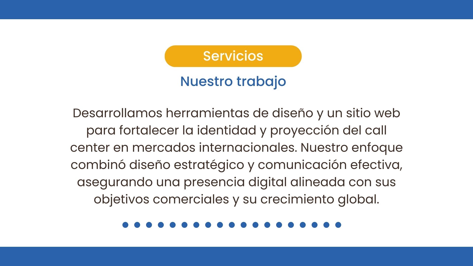Desarrollamos una presentación y un sitio web para fortalecer la identidad y proyección del call center en mercados internacionales. Nuestro enfoque combinó diseño estratégico y comunicación efectiva, asegurando una presencia digital alineada con sus objetivos comerciales y su crecimiento global
